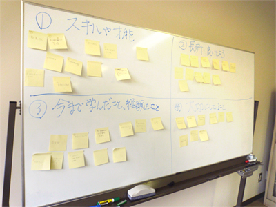 ※左画像を参照いただくと“G.W”のプロセスが少し伺えます。上から2段目:ホワイトボードには4つに区切られたエリアにそれぞれ「スキルと才能」「長所・良いところ」「今まで学んだこと・経験したこと」「大切にしていること」と書かれているのが読み取れます、ここから始まるわけですね。