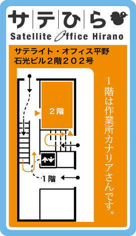 ![]() 歩道から見上げた2階ウィンドウにオレンジ&ブルーの看板が目に飛び込んできたら到着、そこが“サテひら”です。 フロアーが目立つのに対しビル入り口は幾分目立ち難いので上周辺マップに念のためビル経路図を用意しました、ご利用下さい。 |